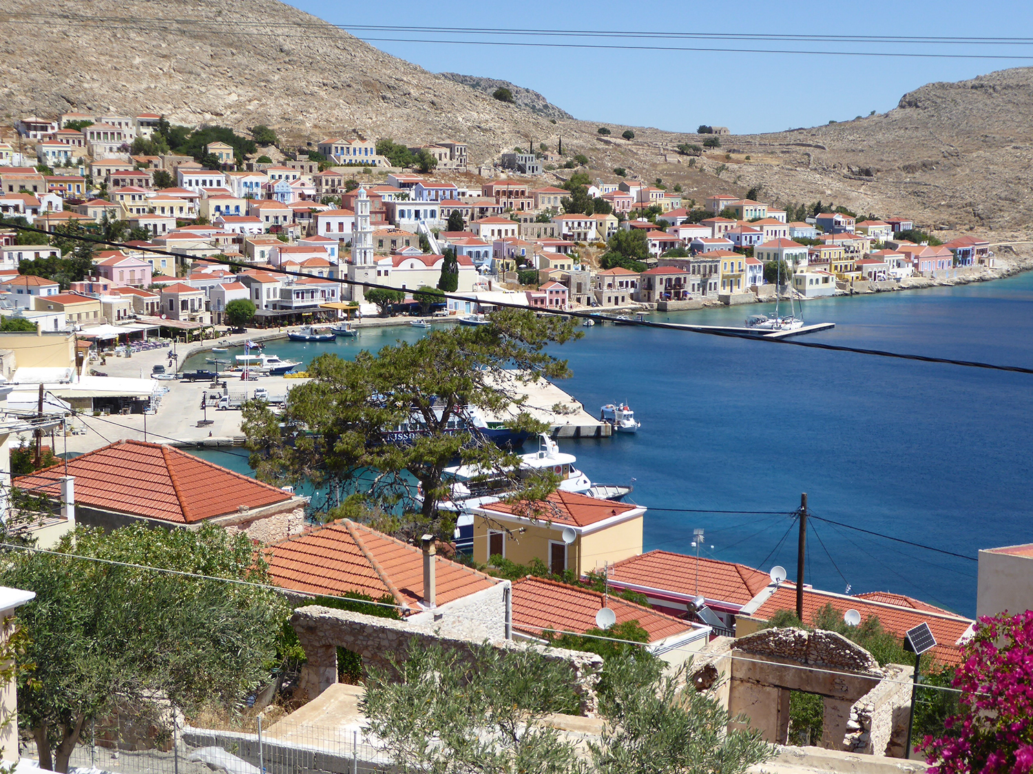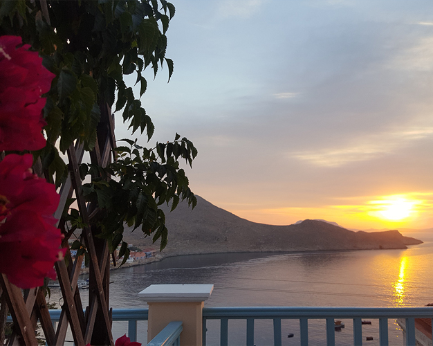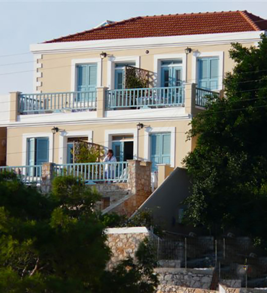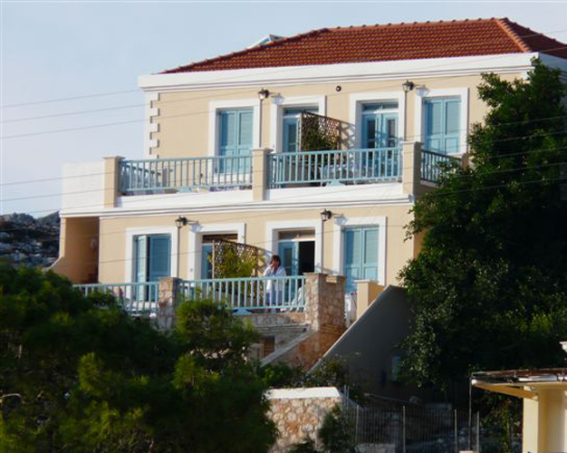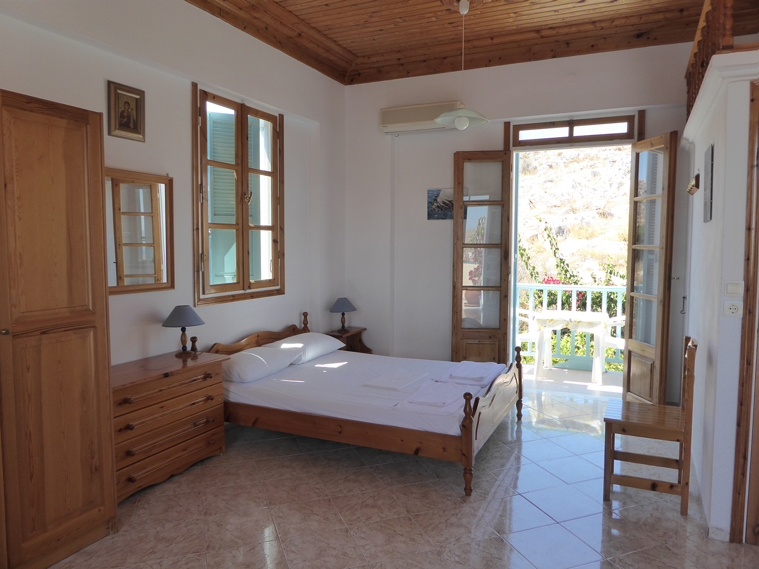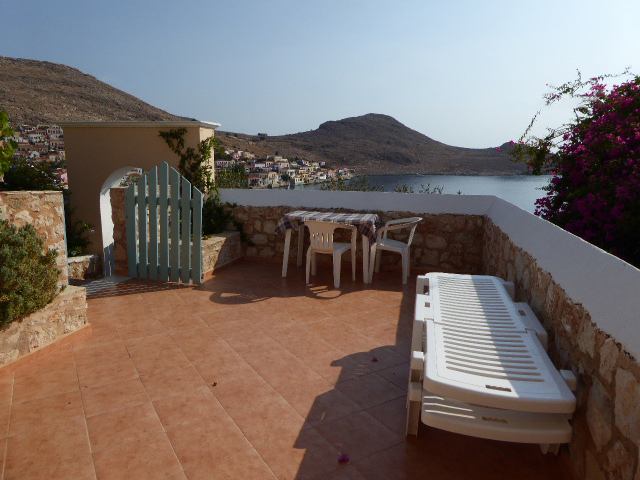 Stone stairs on either side of the building lead up to these light and airy studios. The front terraces have breathtaking views down to the harbour and across to the islands of Alimnia and Rhodes. Each studio has an additional rear balcony with views over the hillside towards the island’s windmills and beyond.